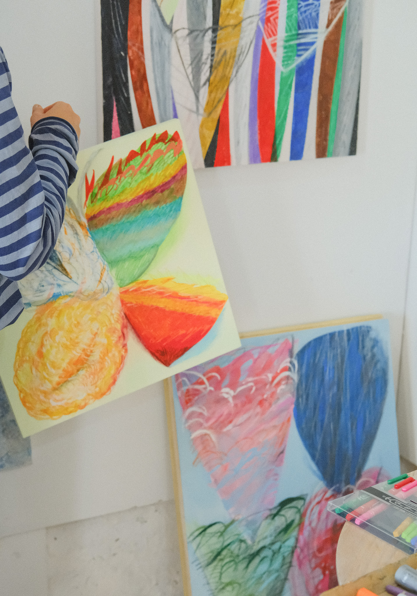 「小さな葉書がどんどん大きくなってきて、渡す相手も、一対一からもっと大きな規模というか、街全体、もっと言うと地球ぜんぶを喜ばせたい、みたいな感じになっています。自分が宇宙を喜ばせて、それによって地球の人たちも喜ぶというような、そんなふうに視野が広がっている感じがあるんです。今は大きなキャンバスに描くようになってきて、そこには、宇宙に響かせたい!という気持ちがあります」