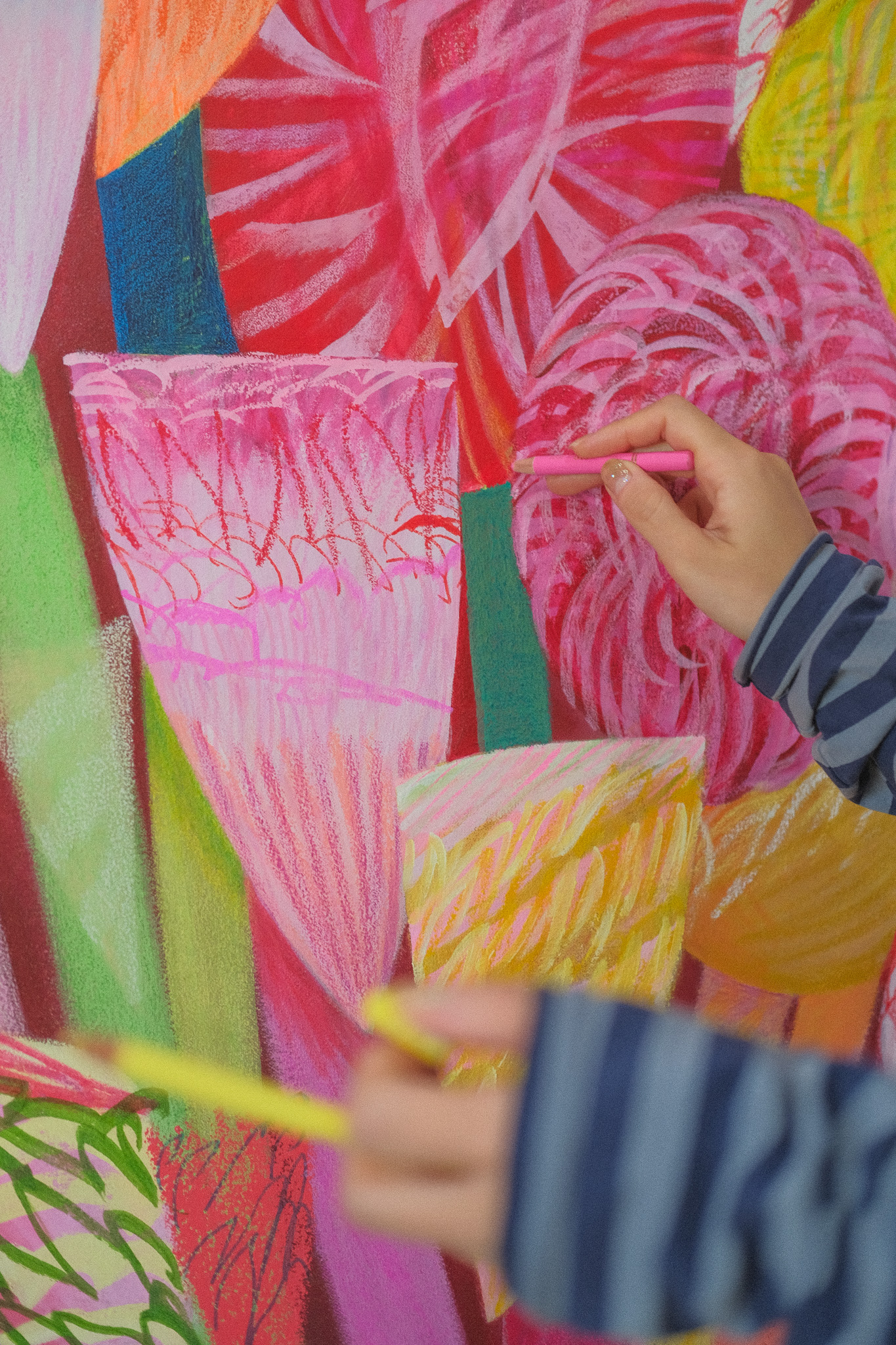 私が自分のアトリエで大きな絵を描いているとき、誰にも見られていないから、遠慮せずに身体を思い切り使って描きます。恥ずかしさも抵抗もない。心を躍らせながら絵を描くとき、自分の手や腕、腰や足は踊っていると思う。以前、私の絵を見て『歌が聴こえてくる』と言ってもらったことがあって、それはとても嬉しかったし、絵でも音楽的な体験って作れるんだ!って思いました」
